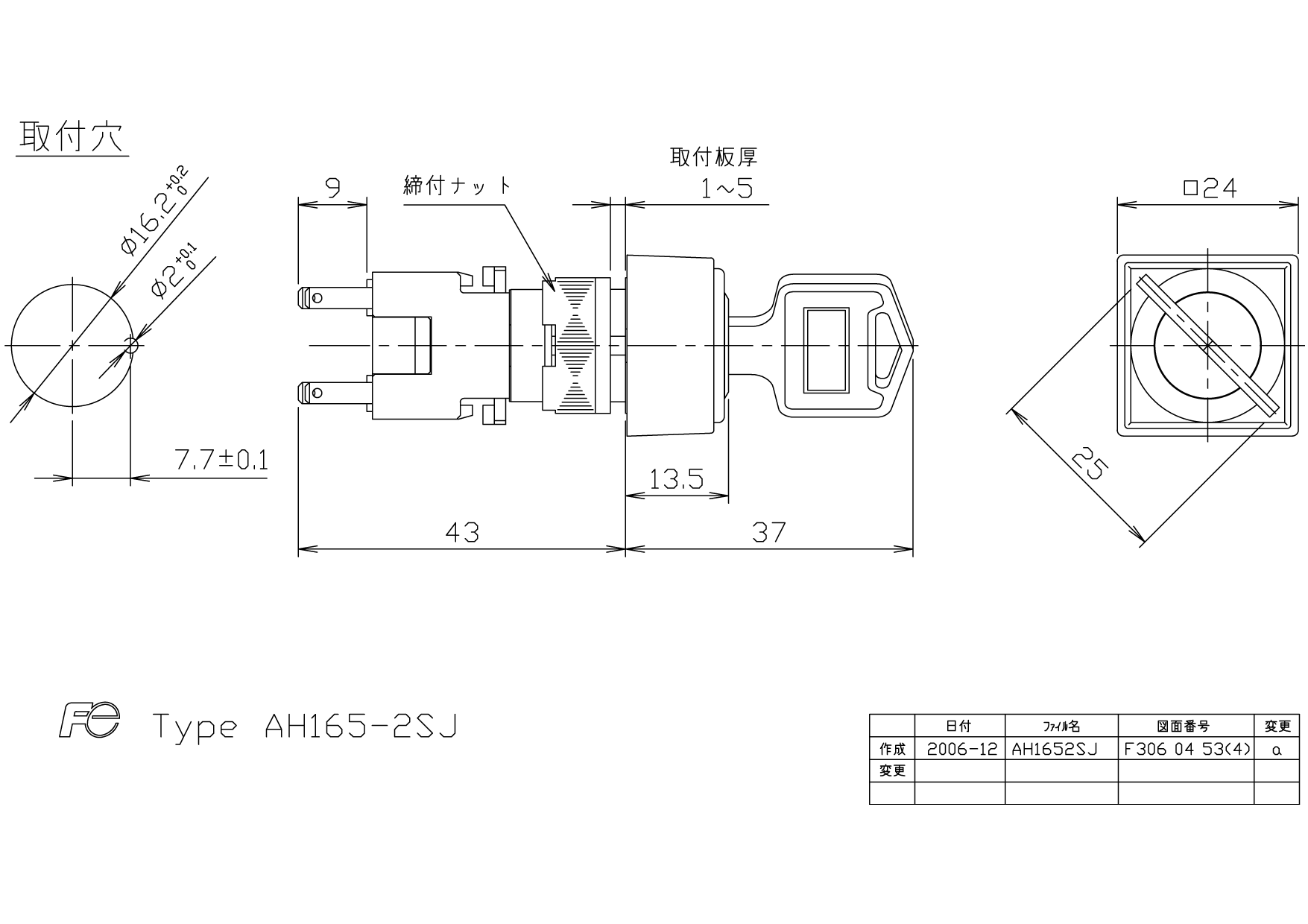 製品区分:製品本体 / 用途:セレクタスイッチ / 取り付け穴サイズ:φ16 / フレーム形状:角 / 操作部・表示部形状:キー形 / 復帰方式:自動 / 接点タイプ:標準形 / ノッチ数:2 / 接点構成:1a1b / キーの抜け位置:左・右 / キーの種類:F / 端子形状:ロック対応端子(#110)兼はんだ端子 / 特長(シリーズ):防油大形/AH165-2シリーズ