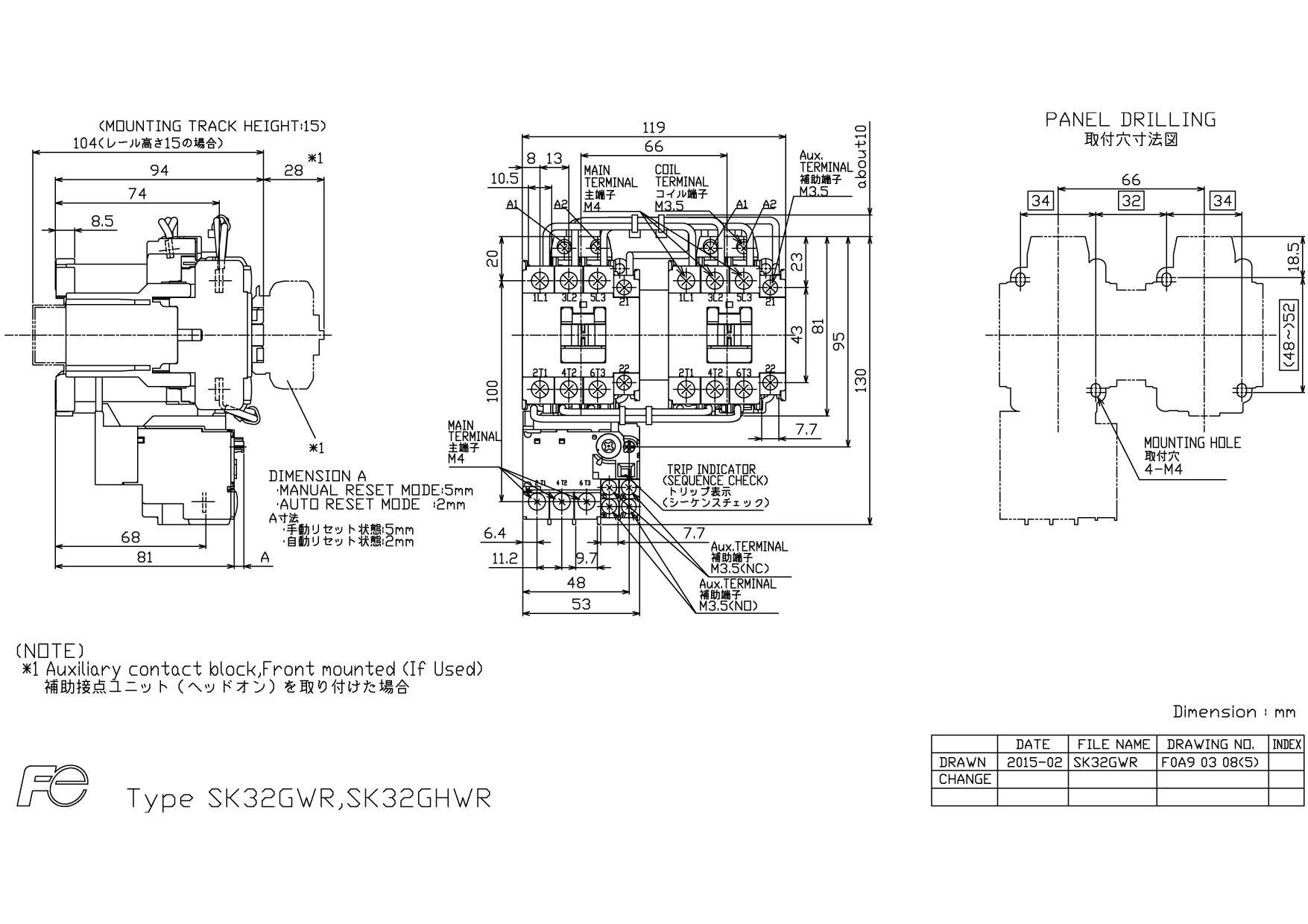 製品区分:製品本体 / サーマルリレー有無:サーマルリレー有 / 操作コイル仕様:DC操作(又はAC/DC共用) / 操作コイル周波数:50/60Hz / コイル電圧:100V / サーマルリレー定格:5-7.5A / 補助接点構成:1b / ケースカバー有無:ケースカバー無可逆形 / 端子カバー有無:端子カバー付 / 電磁接触器定格電流値:32A / 電磁接触器仕様:標準形 / サーマルリレー部仕様:3素子欠相付(2E) / 製品特長:幅狭形(SK) / 外形寸法(mm):53×130×94